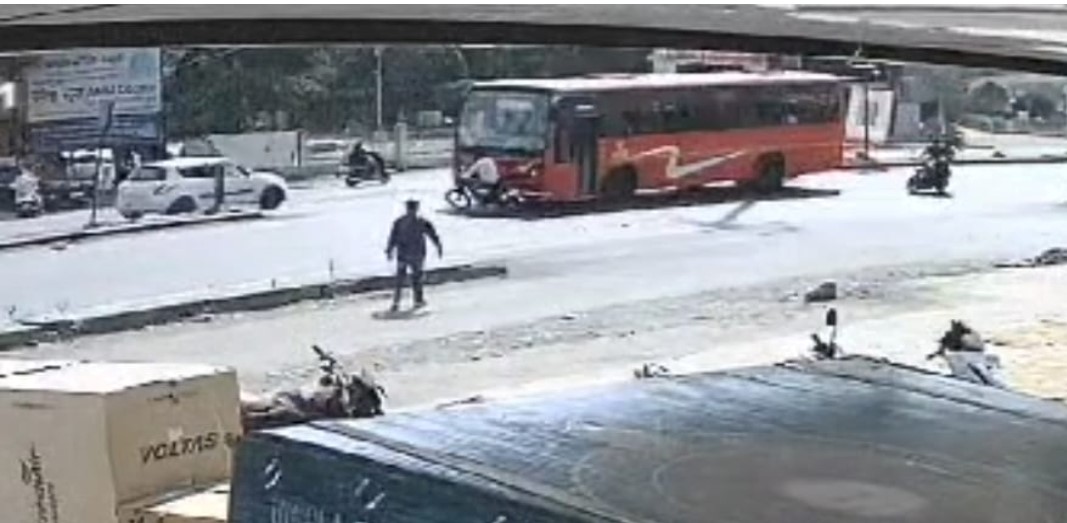 लोणी काळभोर : पुणे -सोलापूर राष्ट्रीय महामार्गावर बस व दुचाकीचा अपघात झाल्याची घटना घडली आहे. ही घटना कदमवाकवस्ती (ता. हवेली) ग्रामपंचायत हद्दीतील कवडीरस्ता चौकात सोमवारी (ता. 14) दुपारी सव्वा तीन वाजण्याच्या सुमारास घडली आहे. या अपघातात दुचाकीस्वार गंभीर जखमी झाला आहे. तर या अपघाताचा व्हिडीओ सोशल मिडीयावर व्हायरल झाला आहे.