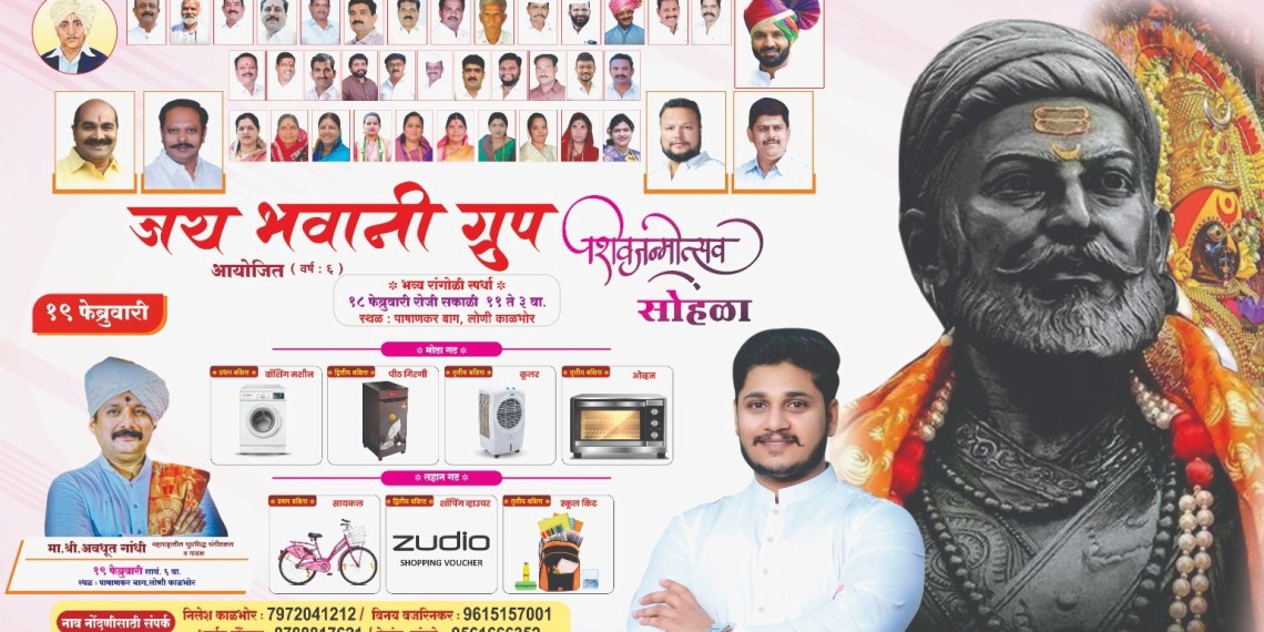 दरम्यान, रांगोळी स्पर्धेसाठी नावनोंदणीसाठी निलेश काळभोर (7972041212), विनय वजरीनकर (9615157001) व भार्गव दौंडकर (8788817621) यांच्याशी संपर्क साधण्याचे आवाहन जय भवानी ग्रुप व मित्रपरिवाराच्या वतीने करण्यात आले आहे. शिवजयंतीच्या पार्श्वभूमीवर संगीत, कला आणि समाजसेवेचा संगम साधणारा हा उपक्रम नागरिकांसाठी खास आकर्षण ठरणार आहे.