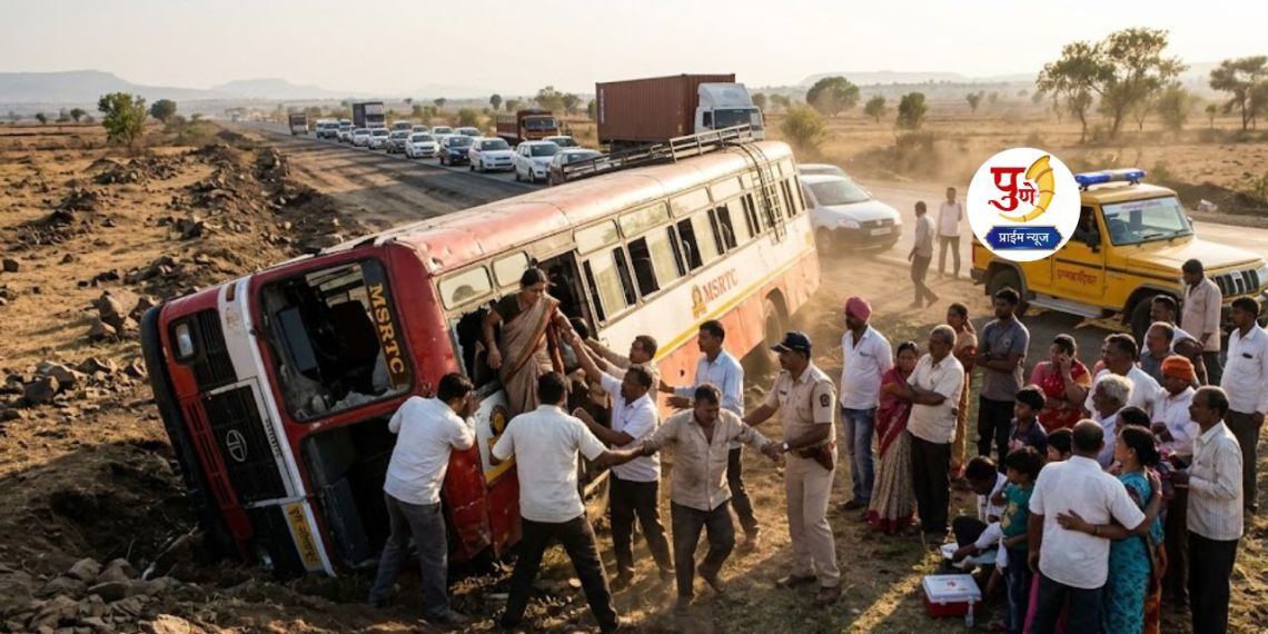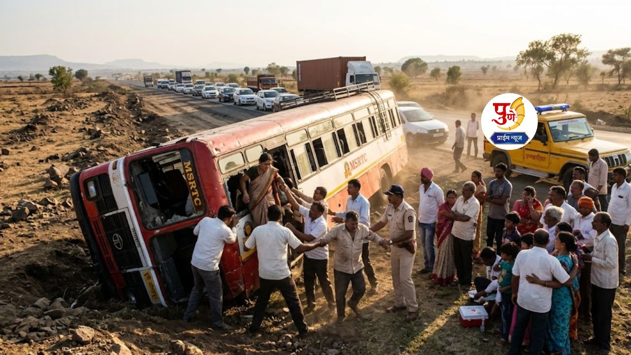 सोलापूरहून पुण्याच्या दिशेने निघालेली ही बस आपल्या निर्धारित वेगात धावत होती. मात्र, मागून येणाऱ्या एका कंटेनर चालकाने अतिघाईत ओव्हरटेक करण्याचा प्रयत्न केला. महामार्गावर सध्या सुरू असलेल्या रुंदीकरणाच्या कामामुळे रस्ता अरुंद झाला आहे, याचा अंदाज कंटेनर चालकाला आला नाही. त्याने बसच्या उजव्या बाजूला जोरदार धडक दिली. हा धक्का इतका तीव्र होता की, चालकाचे नियंत्रण सुटले आणि बस रस्त्यावरून खाली घसरत जाऊन पलटी झाली.